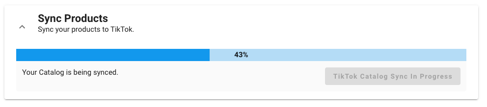 Once your products start syncing, you will see the message Your Catalog is being synced as well as a progress bar indicating the status of your sync. Once complete, you'll see a green checkmark on the far-right side of the page.
