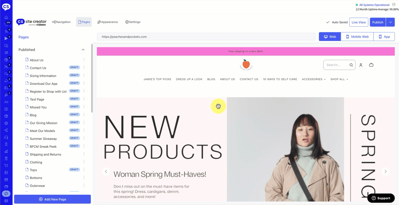 Working on a design for a new home page or collection, and want to see how the page would look to those browsing your site? Site Creator’s Live View function opens the current page you’re designing in a new browser tab so you can see how it appears outside the editor.