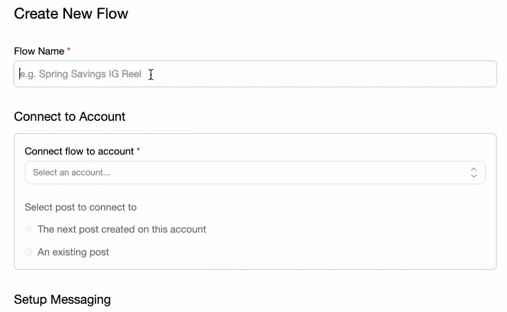 - The next post created on this account. This option will link the CommentChat flow to the next post or Reel posted to the selected account. It will not link to the next post if the post is a live sale. You must create the next post within 48 hours or the CommentChat flow will be deactivated.