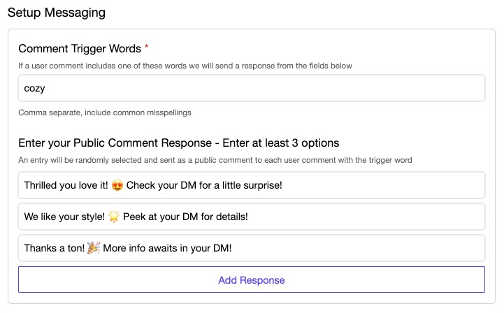 - CommentChat will choose from these options at random when replying to a comment containing a keyword.