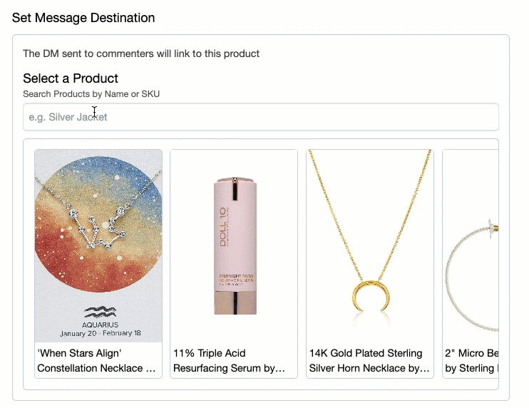 - In the Select a Product field, search for the product you wish to link to in your DM. You can search by brand name, product name, or SKU.