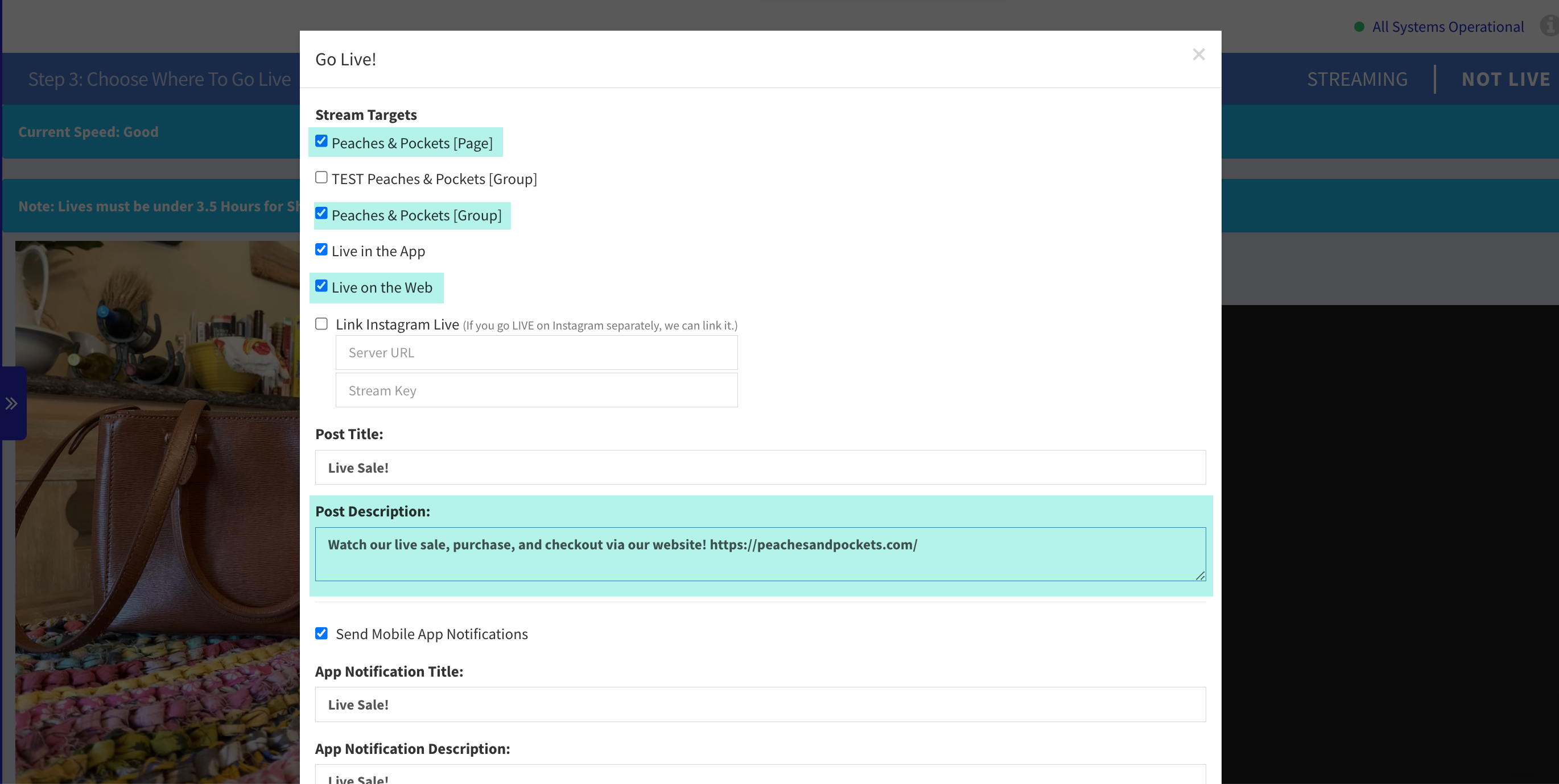 Since you will be directing shoppers to your CommentSold link, you want to make sure you go live on your Facebook page and your website or app. Additionally, you can choose to include the link in the Post Description field. This will add the link to the live sale’s post description.