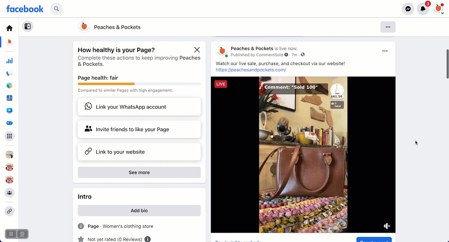 Once you are live on Facebook, you can head to your Facebook page to pin a link to your CommentSold website or app in the comments of your live sale post.