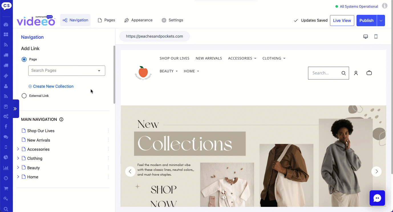 - Select Shop All and drag it to the Main Navigation. Make sure you place this option where you wish for it to appear in the navigation menu.