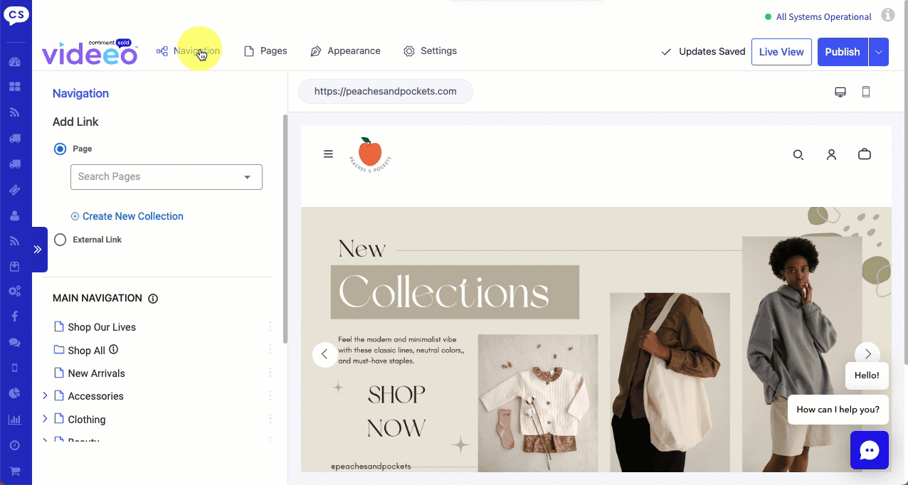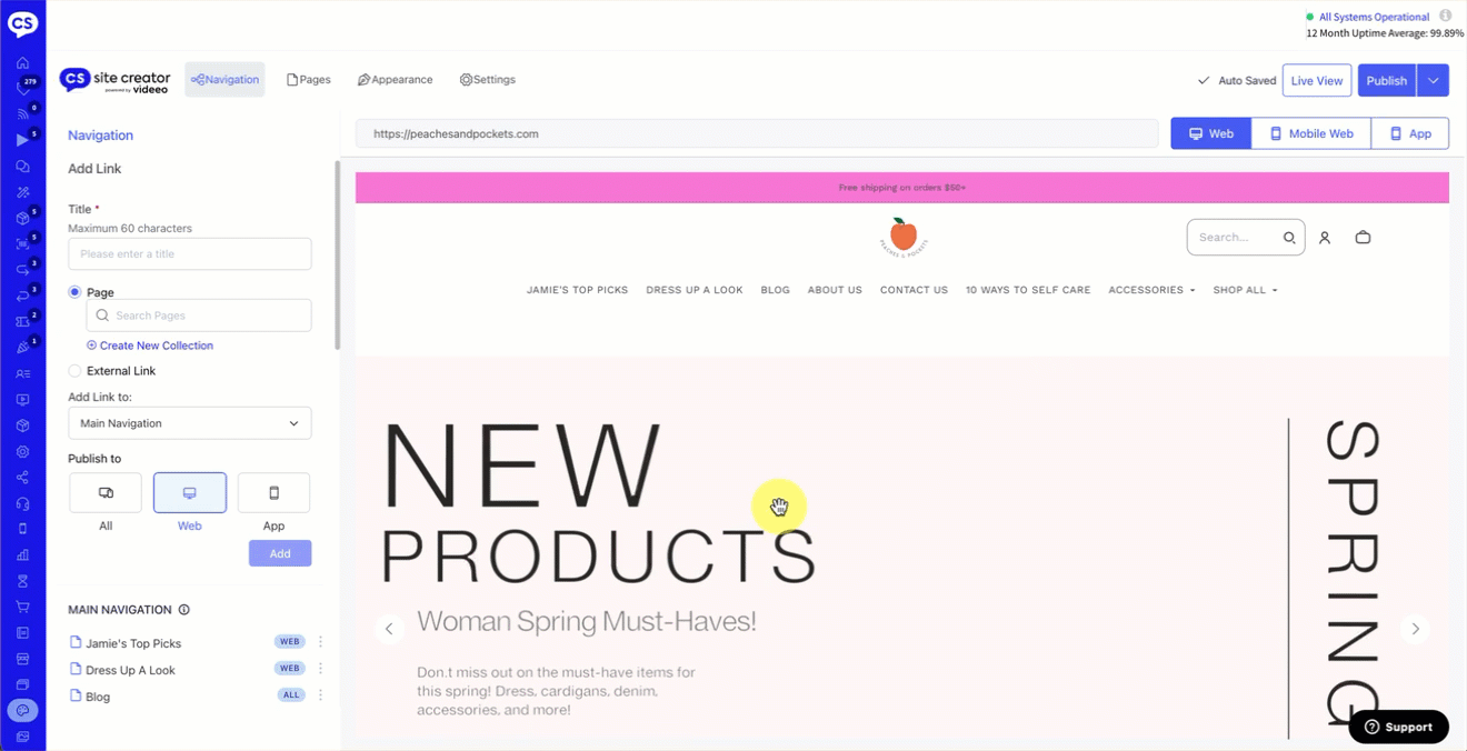 - Locate the Shop All menu option on the Navigation tab in your Site Creator.
