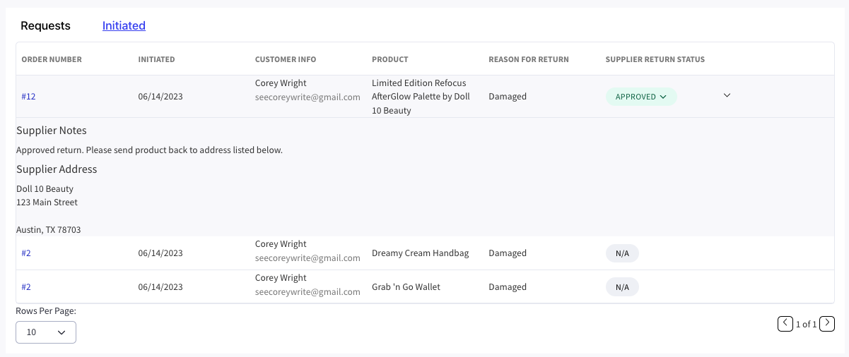 Once you have initiated a return, each product will appear as its own row on the Intiated tab.