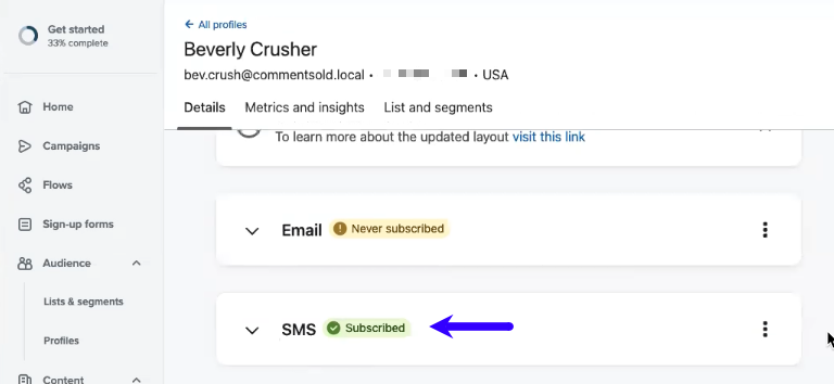 Once you have uploaded your list of SMS subscribers from CommentSold, Klaviyo will verify those customers as “Subscribed.” This means you’ll be able to send SMS marketing messages those shoppers who opted into SMS prior to your enabling SMS for Klaviyo.