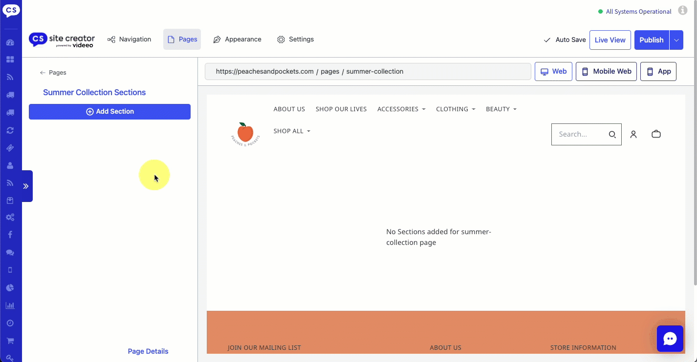 - Select + Add Section at the bottom of the Site Creator side menu.