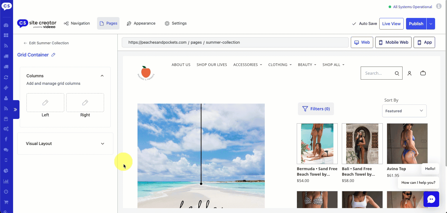 The page you’re building will refresh with each edit or adjustment you make. For example, if you change how many columns of products appear in a product grid, the page will refresh to show your desired view.