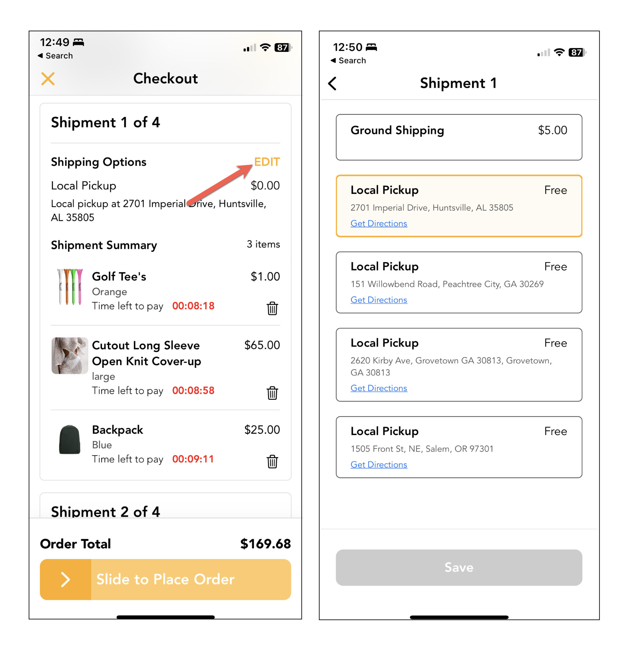 If you offer local pickup, then shoppers can change the shipping option for your shop-specific shipment by select EDIT in the top-right corner of the specific shipment summary.