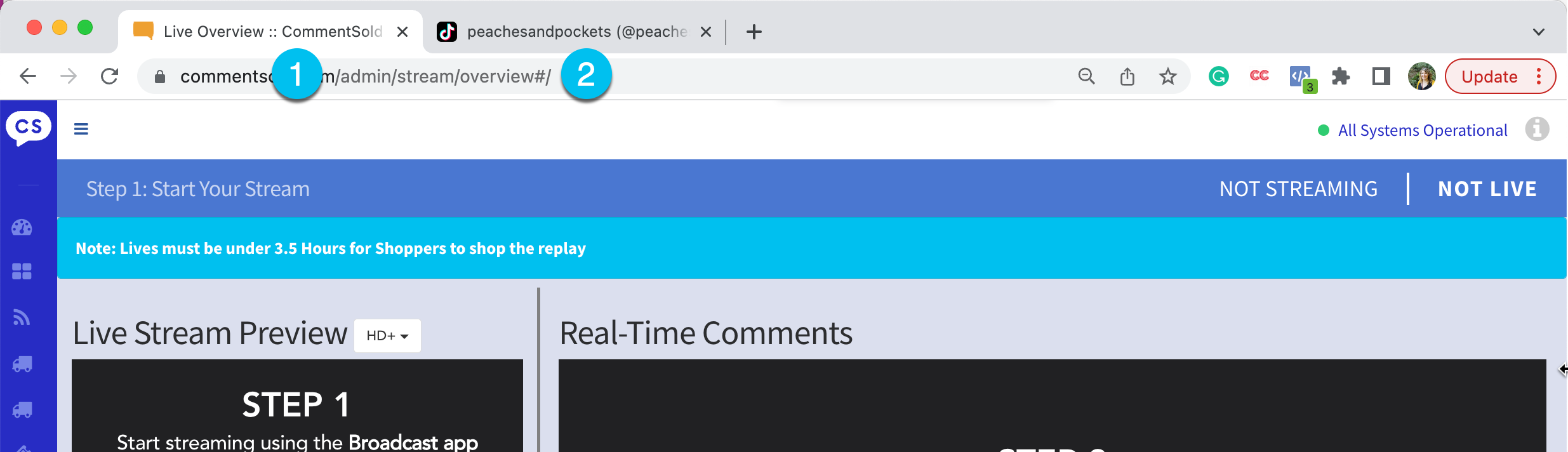 Ensure you are logged into both your TikTok creator account (e.g., @mybusinessname, @shopbluestone, etc.) and CommentSold in separate tabs in the same browser window.