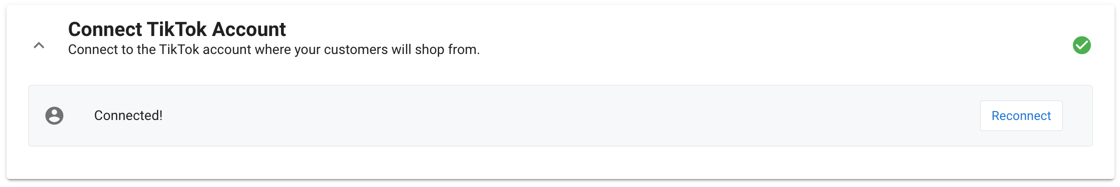 You will be redirected back to your TikTok page in CommentSold. You should see a Connected! message well as a green checkmark on the far-right side of the page.