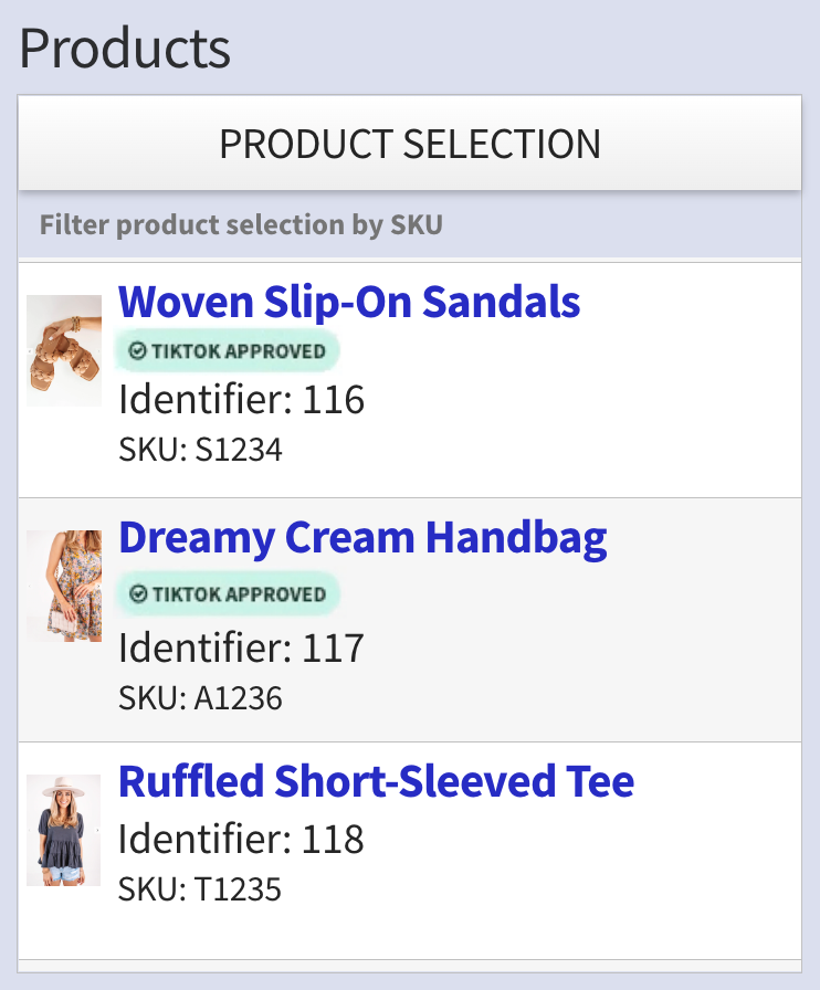 Products approved by TikTok will display a green TikTok Approved badge beneath the product name. We recommend only showing products that are TikTok-approved if you are going live on TikTok. If you attempt to select a product that isn’t approved, you will receive an error message in the bottom-left corner of your Live Overview.