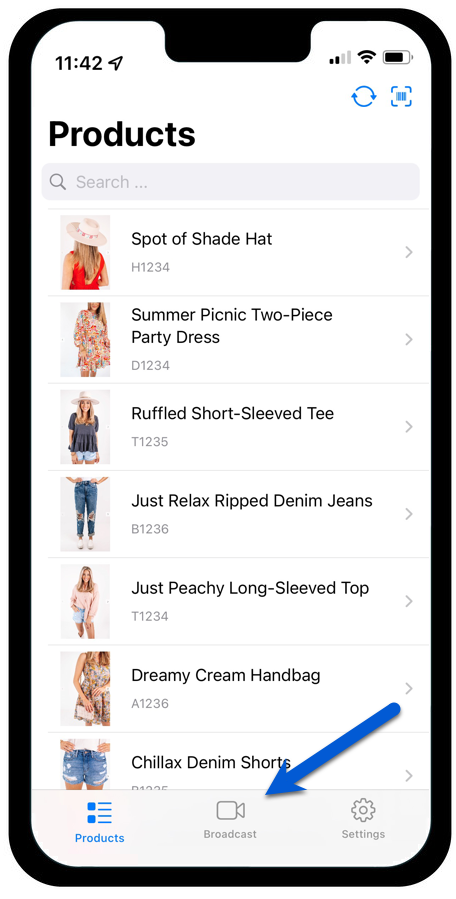 - If you are using an iOS device, you will be taken to a Products listing. Select the Broadcast icon at the bottom of the screen. This takes you to your broadcast camera view.