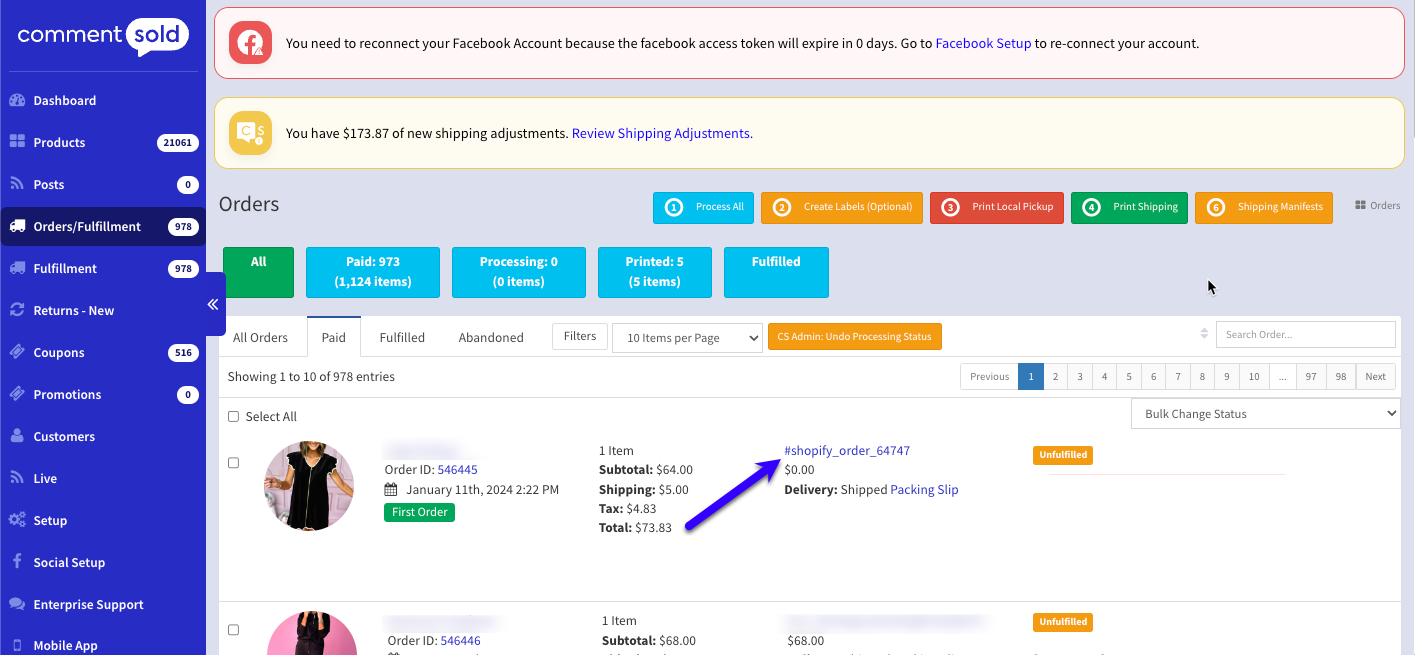 Issue: Order fulfilled in Shopify not showing as fulfilled in CommentSold