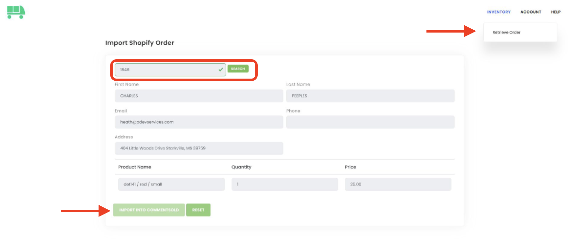- Under the Inventory tab, select Retrieve Order.