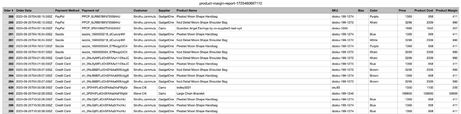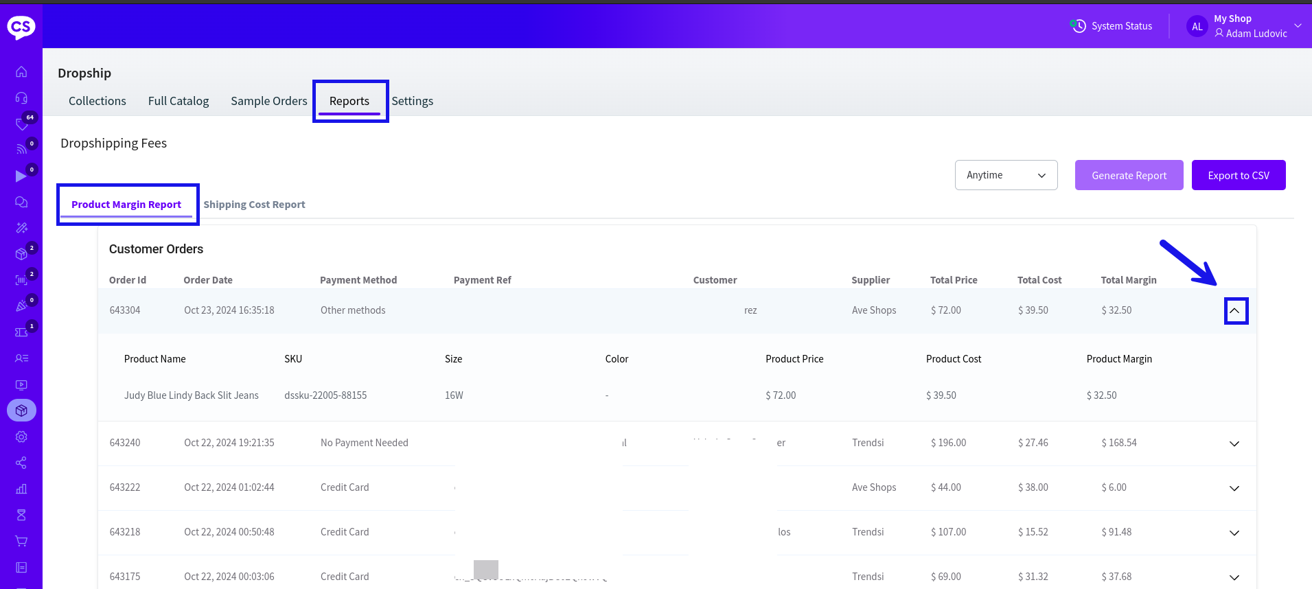 - Select the desired type of report tab. Product Margin Report or Shipping Cost Report. You will now see customer orders listed (newest to oldest).
