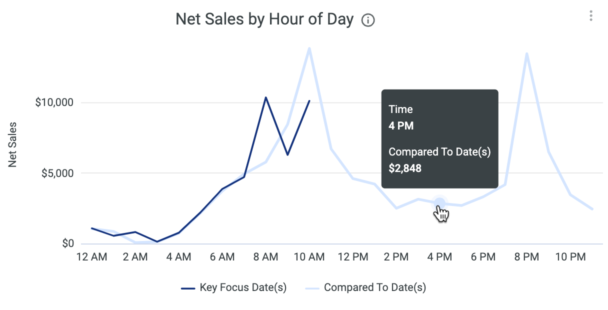 Displays a breakdown of net sales throughout the day for the corresponding day. If you selected a date range, net sales will be an hourly average across the date range. Hover over the graph to see a detailed summary of the hour and net sales total. |