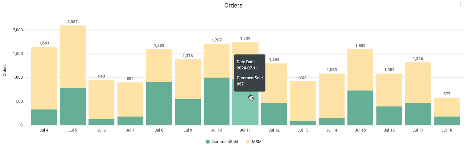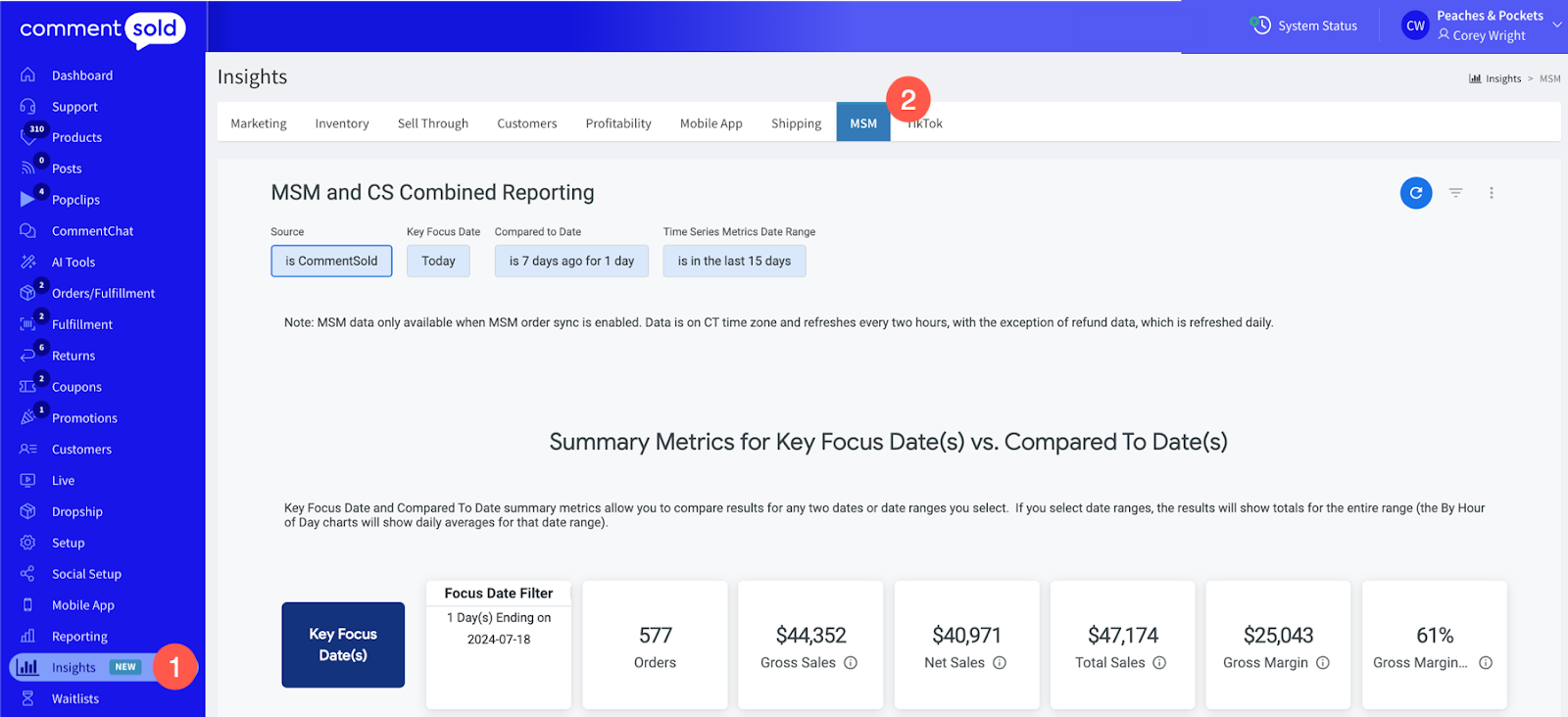 - MSM and CommentSold. View combined data for CS and Shopify generated orders. Note that the Detailed Metrics section of the tab will keep these sources separate but will provide a combined total.