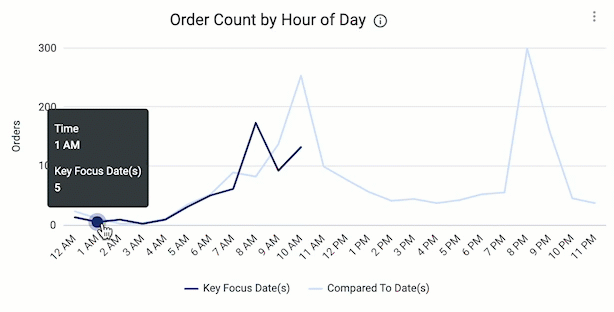 Displays a breakdown of orders placed throughout the day for the corresponding day. If you selected a date range, this count will be an hourly average across the date range. Hover over the graph to see a detailed summary of the hour and order count. |