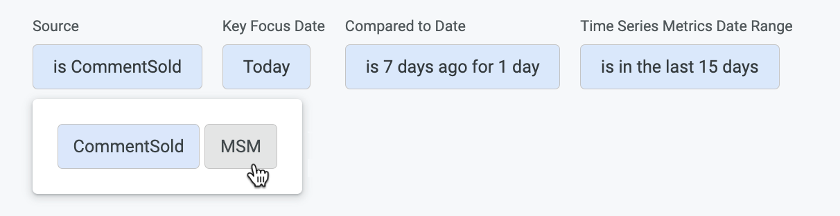 View a breakdown of key metrics by source (MSM and/or CommentSold). These metrics will be for the Key Focus Date(s) and Compared to Date(s) you selected at the top of the page.