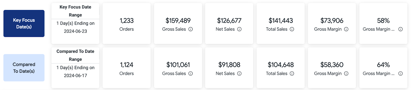 | Gross Margin ($) | Displays net sales less the cost of goods sold for the corresponding date range. |