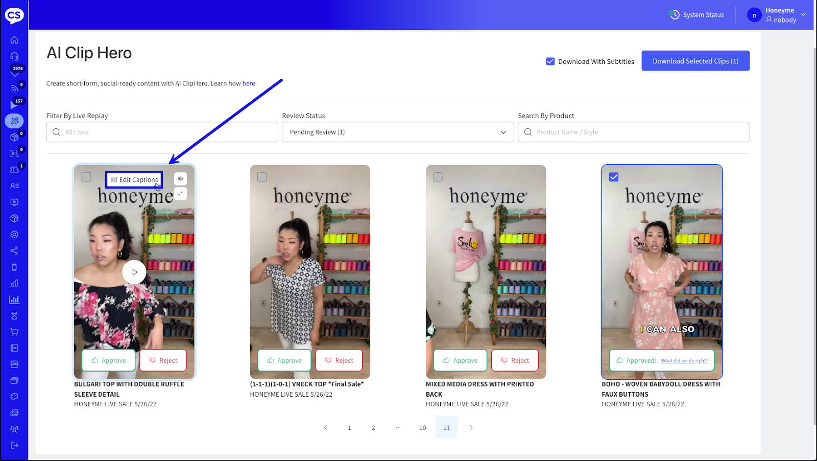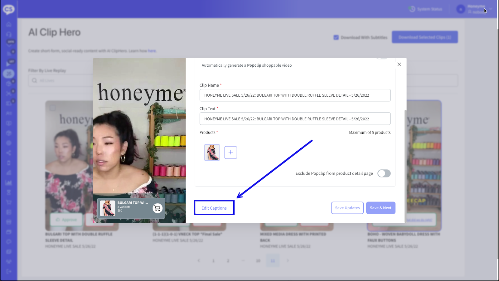 - Hover your desired AI Clip and select Edit Captions.
