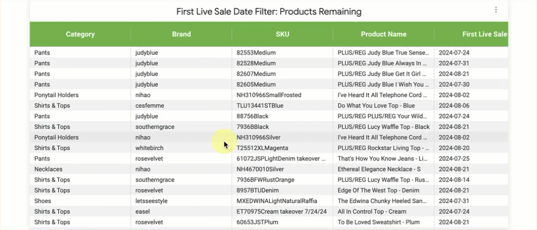 | First Live Sale Date | Displays the date on which a product was first showcased during a live sale event. | Providing insights into the timing of product launches and their impact on sales performance. |