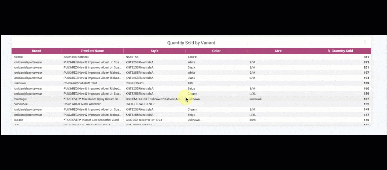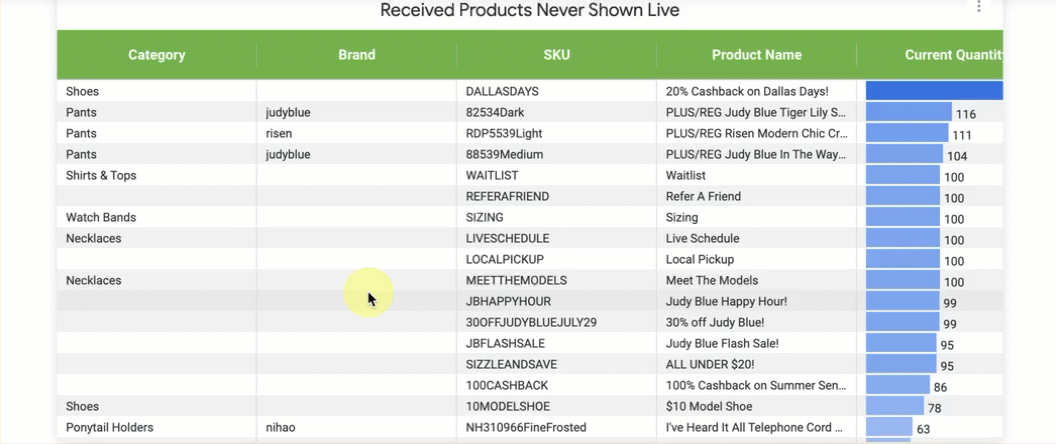 Additionally, maximize your revenue in upcoming live sales by featuring in next live shows the items with the highest Quantity Remaining that haven’t been shown recently or introduce new items highlighted in the Received Products Never Shown in a Live table. With these insights at your fingertips, you'll be better positioned to make data-driven decisions that enhance sales and profitability. Each of the below-listed overviews serves a specific use case.