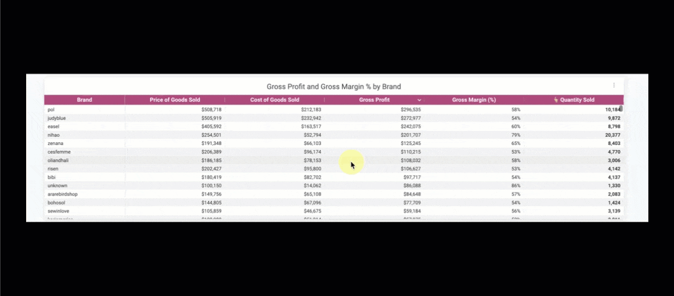 | Gross Margin | Displays the percentage of gross profit relative to the Price of Goods Sold. | Helping assess the efficiency of your pricing and cost management. |