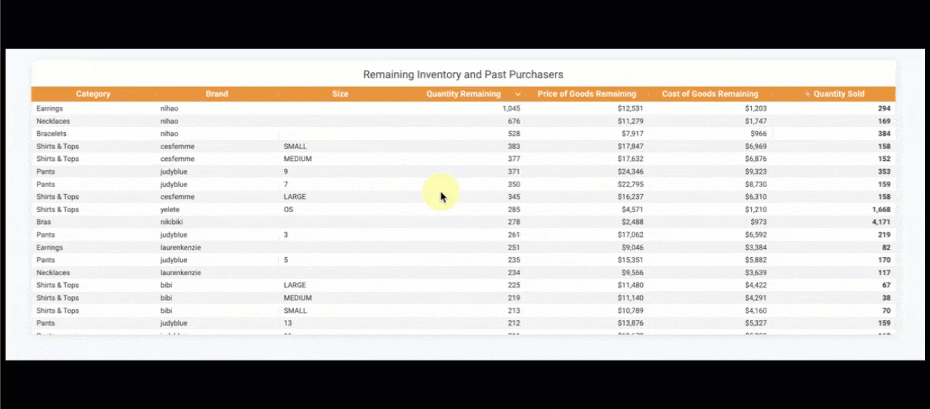 Monitor Remaining Inventory by Category, Brand, Size and which customers have made purchases in those categories to identify additional sales opportunities for the categories with the highest quantity remaining.