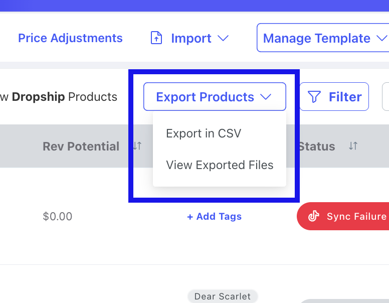 You can now see the new Export Product(s) drop-down. You can use the drop-down to Export Products using a CSV file and View the Exported Files.