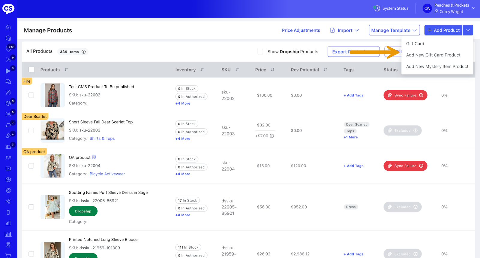 You can now see the new Add Product drop-down. You can add a product by selecting the + Add Product button. You can use the drop-down to Add Gift Card, New Gift Card Product and New Mystery Item Product.