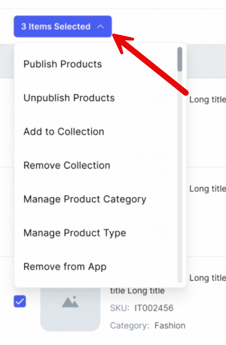You can select products in bulk using the checkbox on the left side of the products and perform different actions using the drop-down at the top.