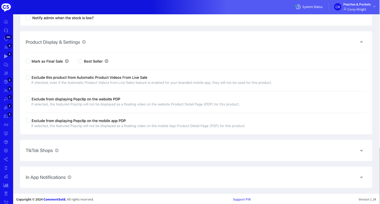 You can now find all the product details on a single page with new sections added, such as Categorization and Tags, Publish Products, Add Product Variants, Add Custom Badges and collapsable sections for configurations like TikTok Shops, Product Display and Settings and In-App Notifications.