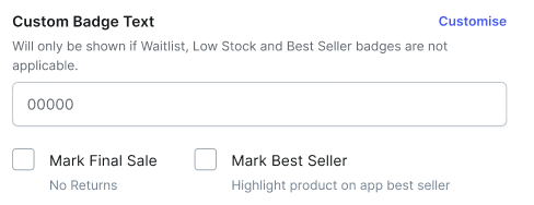 Custom Badges. Enhance your product's visibility with Custom Badges to highlight unique attributes, like New Arrival or Best Seller, helping items stand out to customers. Badges catch attention, add value, and build customer confidence in their purchase choices.