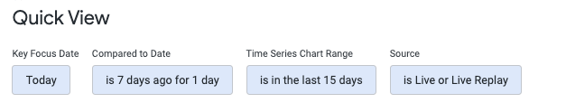 This section of Quick View Insights gives you detailed charts already broken down by source (so they are not further filterable by source) but are filterable by the time series and provide a comprehensive look at overall daily metrics.