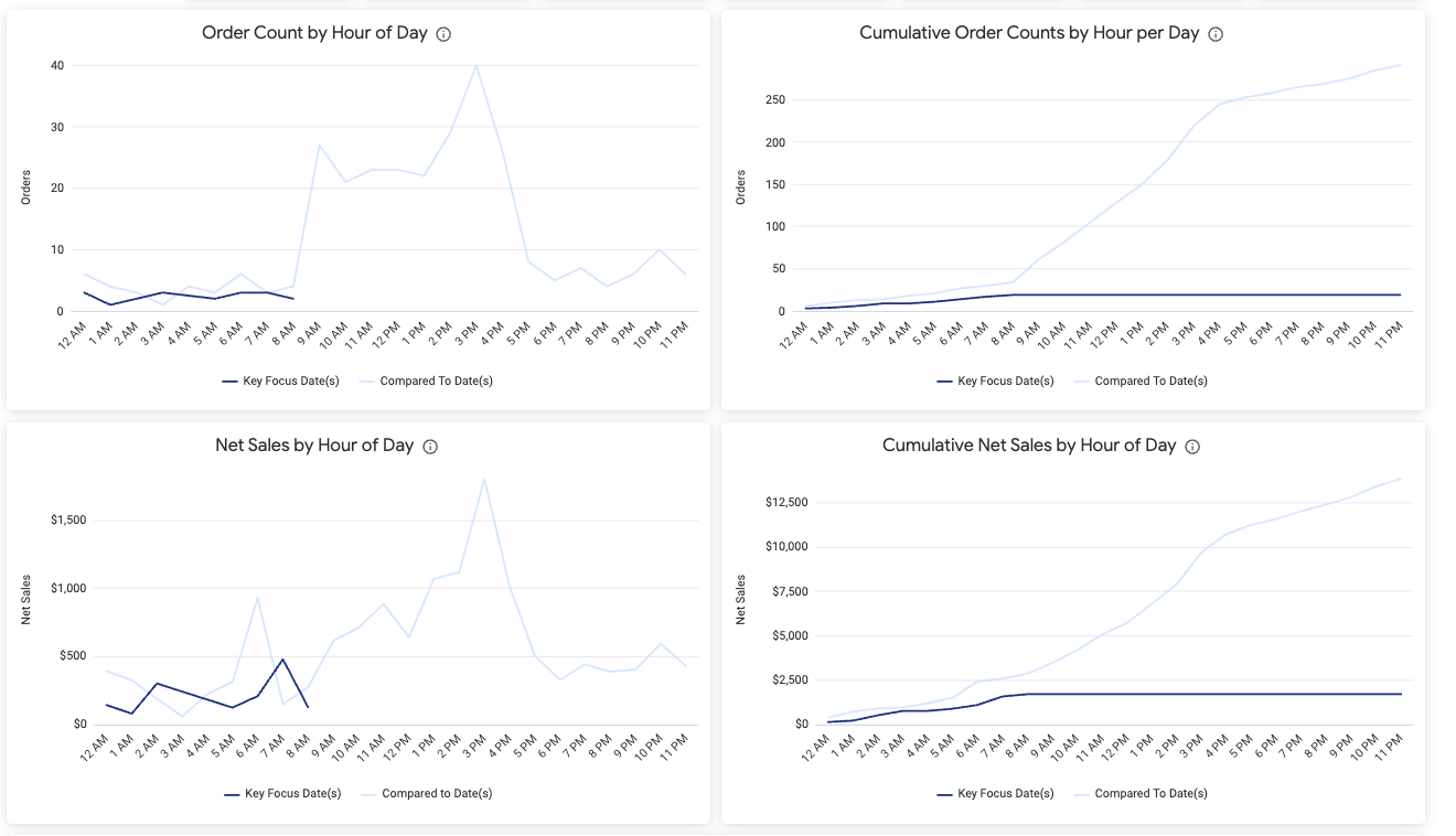 This insight shows how Net Sales vary by hour, helping you identify which hours contribute the most to your revenue. The chart tracks sales trends throughout the day. Note: Cumulative Net Sales are displayed in the tile to the right, allowing you to see how revenue builds up over the course of the day. Use both metrics together for a deeper understanding of hourly sales performance. |