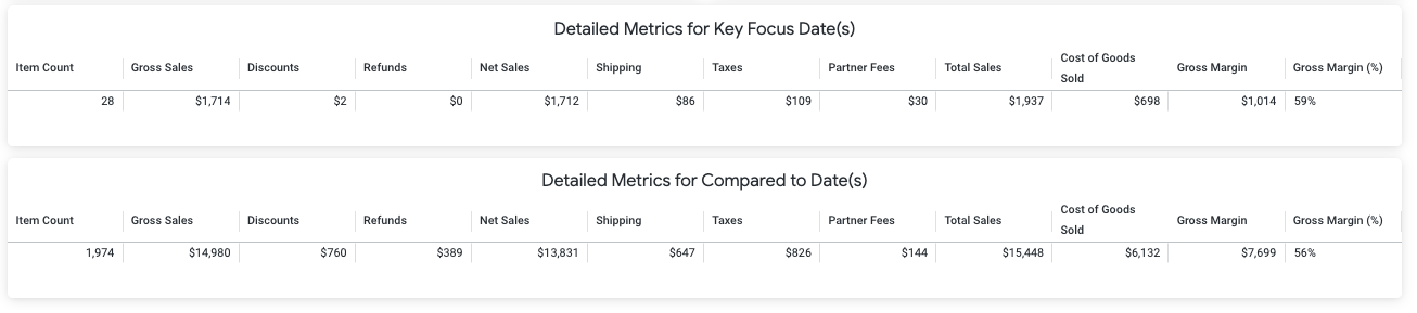 Use this section to drill into summary metrics and view itemized data, giving you a more detailed breakdown of sales performance and customer behavior.