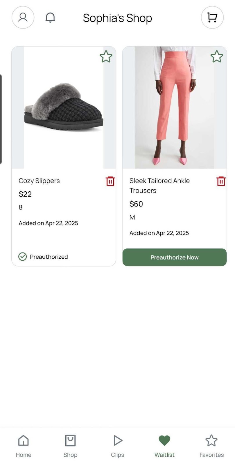 - Clearer Product Layout: Waitlisted items now appear in a structured way, making size, color, and preauthorization status easier to view.