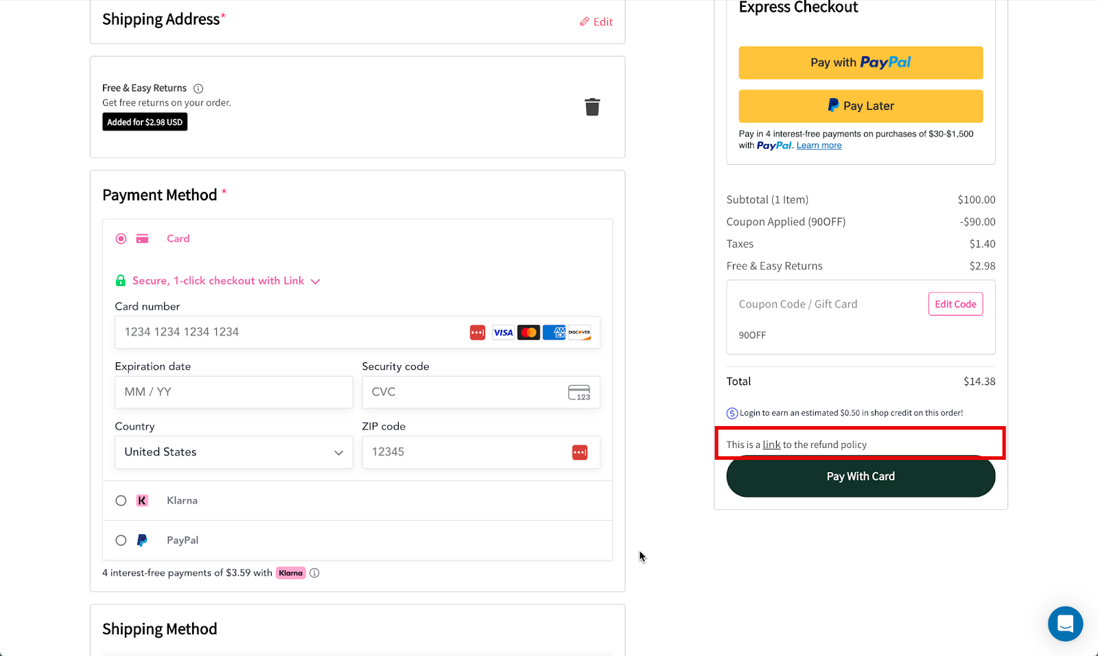 California state regulations require that businesses clearly display refund or return policies before completing a transaction. This feature allows you to meet that requirement by adding a visible link to your refund policy at checkout. Even if you're not based in California, this is a great way to build trust and transparency with your customers.