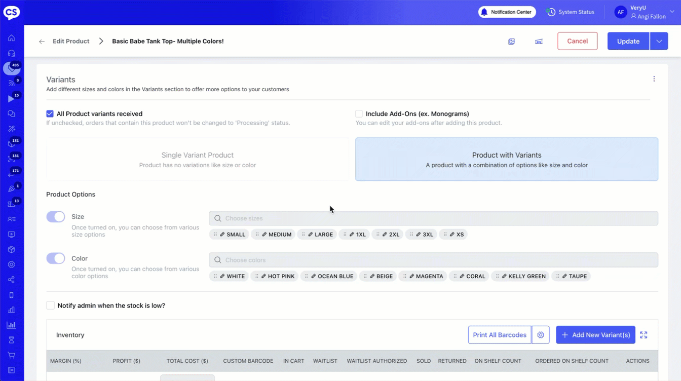 - All Product Variants Received. Select this checkbox if you have received all variants for this product. If all variants haven’t been received, you’ll select only the received variants within the Edit Inventory tab.