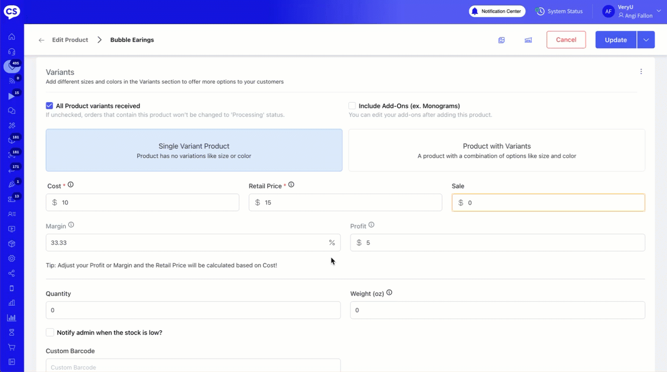 - Cost. Enter the cost of the item. Cost may include other expenses besides the actual cost of the item, such as shipping costs from the wholesaler to you.
