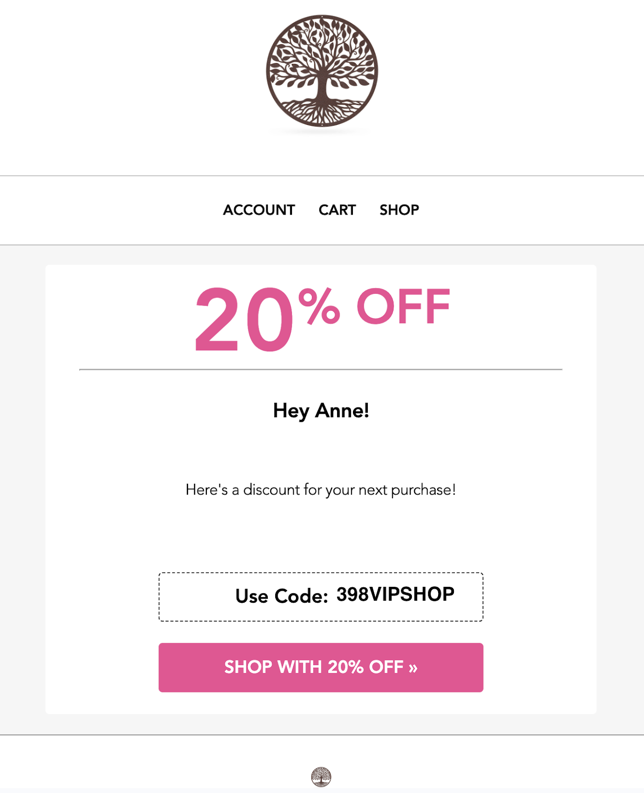 The customer gets an email with their unique discount code. To use it, they must log into their account and apply the code at checkout (guest checkout isn’t supported). The code is tied to their account and can’t be shared. personalized discount codes