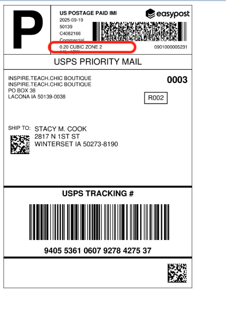 Having Troubles?Here are some common errors and resolutions: Not getting UPS option when using “Best Rate” setting Check your Business Address under Setup>Shop. Your Zip code must have all 9 digits for UPS to verify. (For example, 02895-1238) Error: “Label may appear different than expected” We use multiple label providers for CS Shipping to ensure availability and redundancy in the system. Label buying happens through a queue so if it fails through one provider it will attempt with the next. When you see that message “Label may appear different than expected” that means it failed through the primary provider and was purchased through a different one. Charged for shipping labels but I didn’t purchase them. This is related to the auto-purchase pre-paid shipping credit feature. If you purchased (or auto-purchased) shipping credit while fulfilling orders and your payment methods failed, we reverse any amounts (labels) that were applied to your prepaid shipping credit balance during that time. Once you have updated your payment method, we reattempt immediately by reapplying the amount owed to your prepaid shipping balance and then charging any remaining charges to the updated payment method. This can make the timing of the charge appear to occur outside of times you were processing orders. Label marked as Priority Mail instead of Ground Advantage. Check the label for this Cubic marking. If the label has this marking, the label was charged as cubic because the package qualified for the USPS Priority Mail Cubic rate. Priority Mail Cubic Rate is a volume-based pricing option that applies when a package is small but heavy and meets specific size and weight criteria, such as a weight under 20 pounds and a longest dimension not exceeding 18 inches. Why Cubic Pricing Applies: