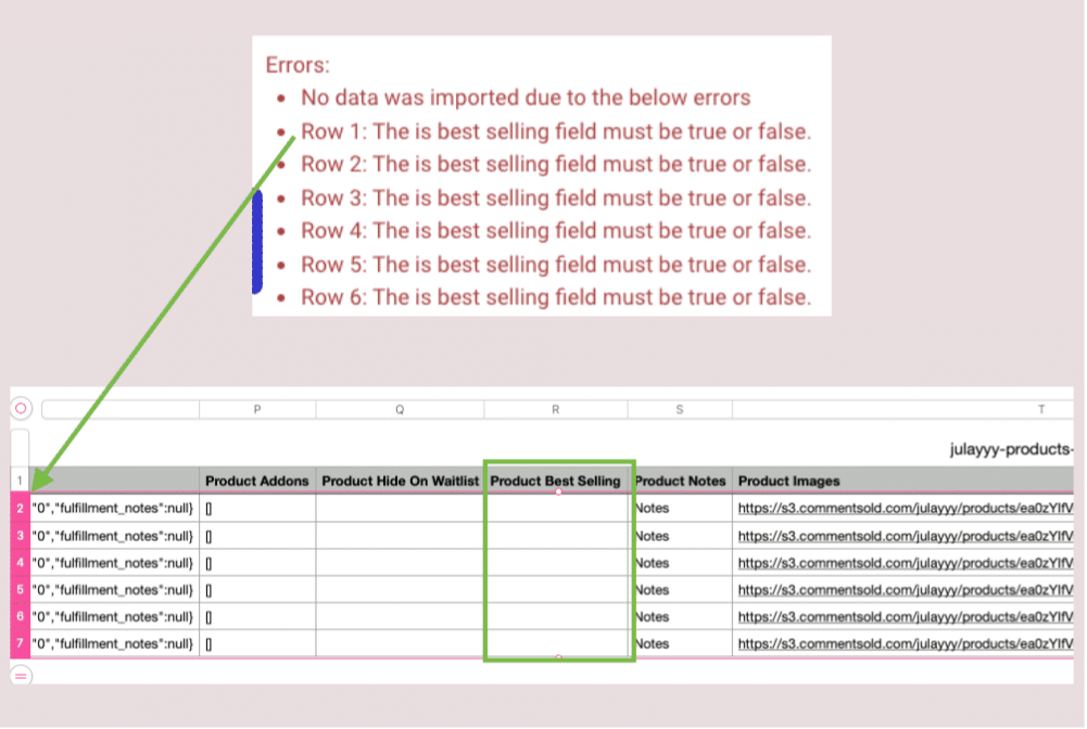 • Error - No data will be imported at all if there are any duplicates. CommentSold will not import any of the products included in the CSV file.