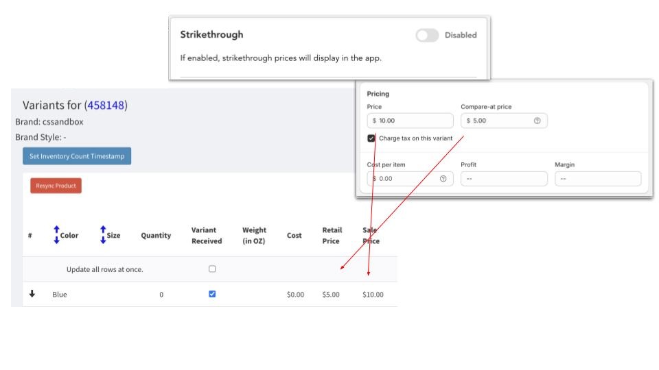 If MyShipManager is not listed in your Installed Apps or the wrong default location is set in MSM, you will need to go to your MSM account, unsubscribe and then subscribe again to resync your account. Issue: Retail price in CS does not match retail price in Shopify Check your Strikethrough settings to see if this is expected behavior. This is likely because you have a sale price added to the items in Shopify and you do not have Strikethrough enabled under the Mobile App tab in CommentSold.