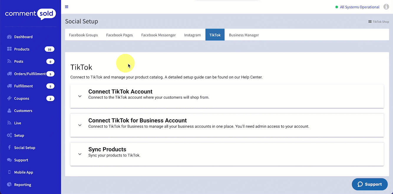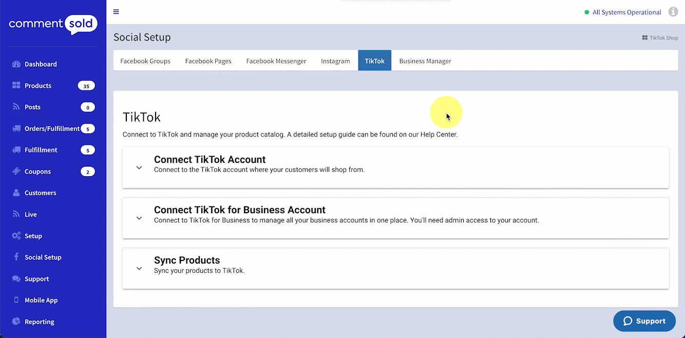 Your first step is to connect your TikTok business account in CommentSold. This is the account you registered with TikTok using tax documentation.