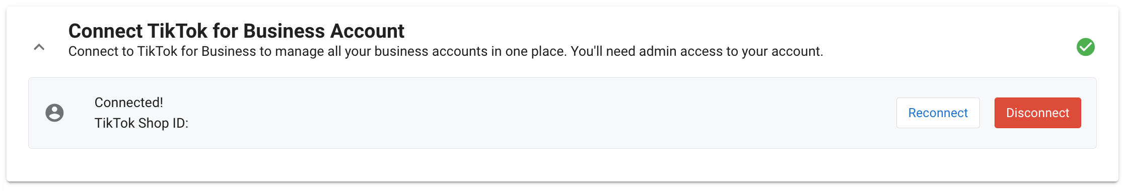 You will be redirected back to your TikTok page in CommentSold. You should see your TikTok Shop ID as well as a green checkmark on the far-right side of the page.