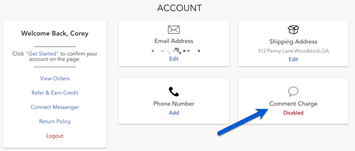 Shoppers will need to save their credit card information before they activate Comment Charge on their account page. Once enabled, they can comment shop for instant invoicing and purchases.